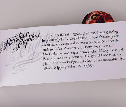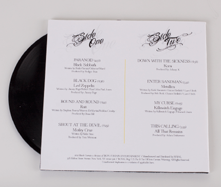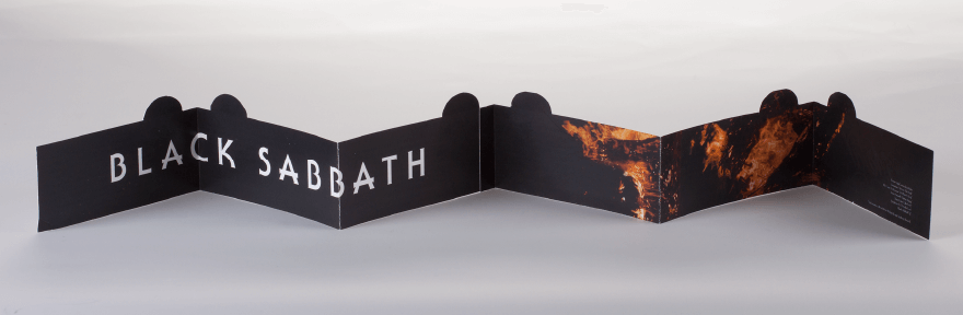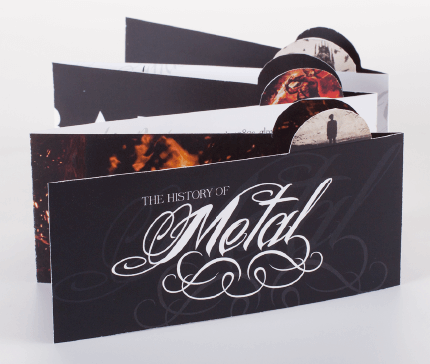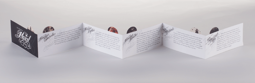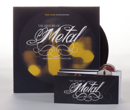 Typographic brochure and vinyl designed for The History of Metal. Mixing a hardcore metal style with soft flowing swashes, the brochure provides details about specific decades while the vinyl provides accompanying song examples.